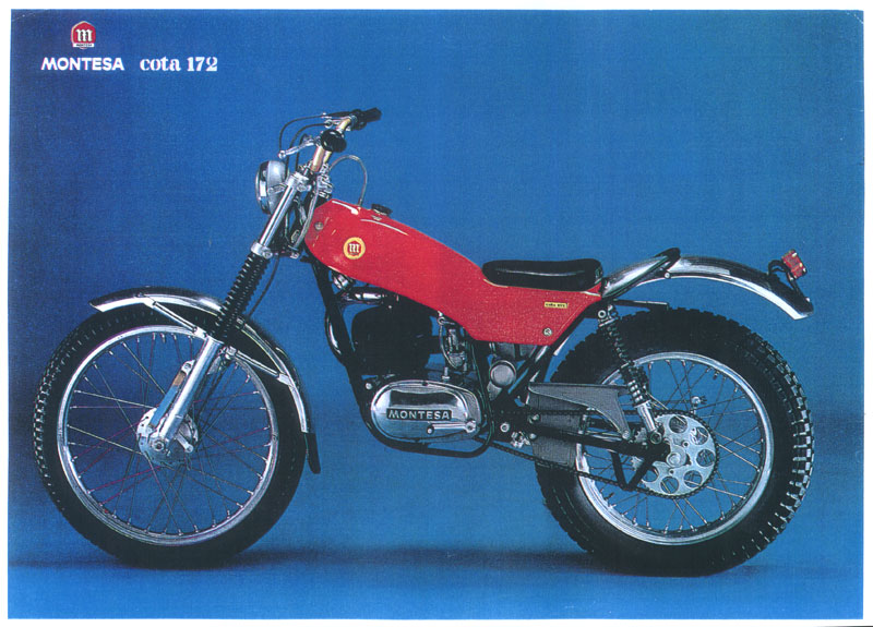 En otoño de 1974 se presenta la Cota 172, basada en la Cota 123 de la que tomaba el chasis, pero con llantas y ruedas grandes 1,75 x 21 la delantera y 4.00 x 18 la trasera. La cilindrada real era de 157,7 cc, no 172, y otras diferencias con la 123 eran las suspensiones, con una horquilla Montesa pero fabricada por Betor más robusta que las de las Cota 74 y 123 pero más pequeña que en las 247. El basculante era más largo que en sus hermanas pequeñas, y una novedad importante fue el manillar Akront de dural, aunque este resultó ser demasiado frágil. En catálogo, es práctyicamente como el de las Cota 74 y 123, en tamaño Din A-4, con una foto sobre fondo azul e incluyendo en el reverso incluye una amplia ficha técnica en español, inglés y francés. |