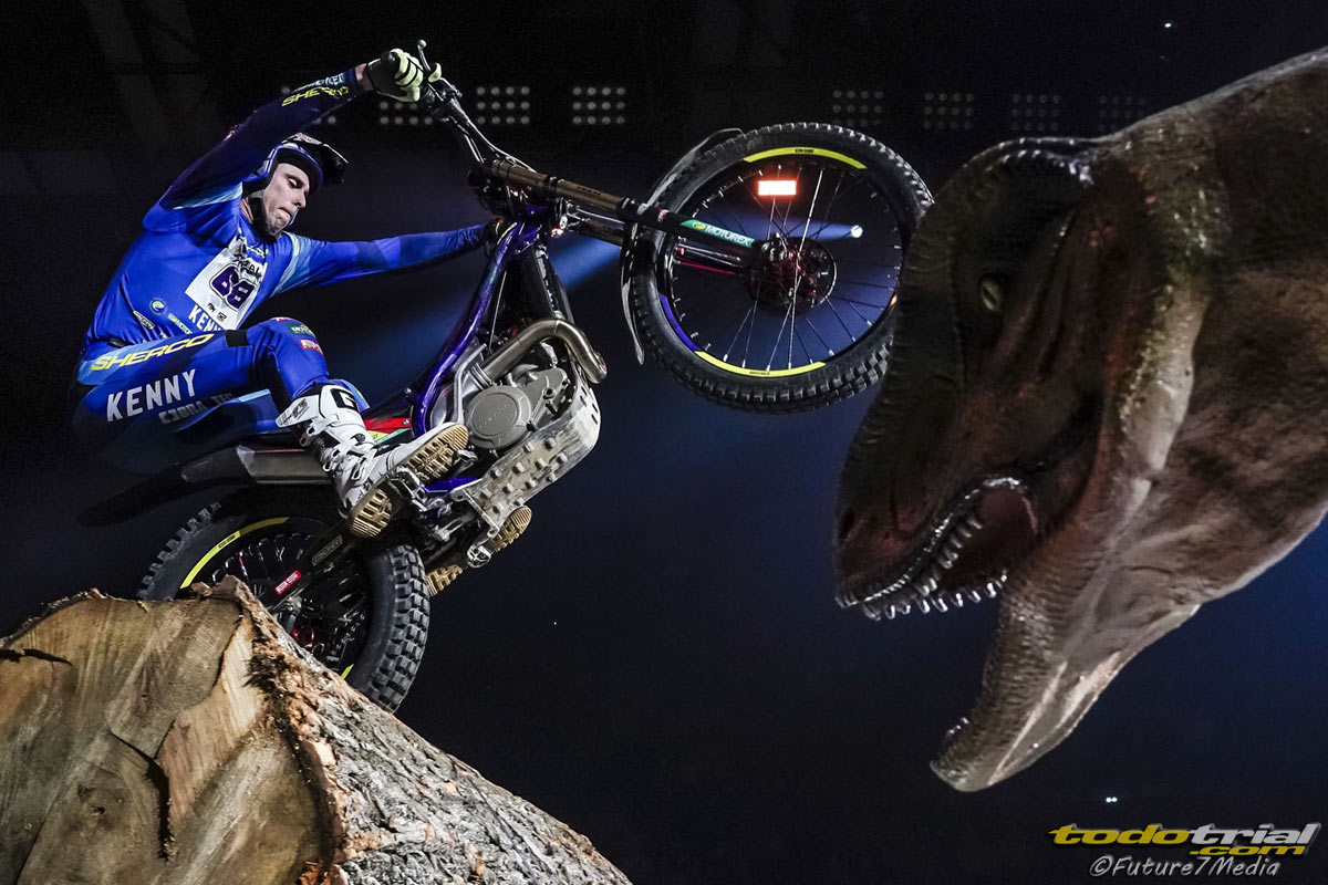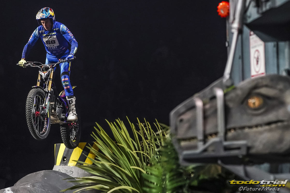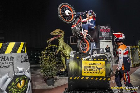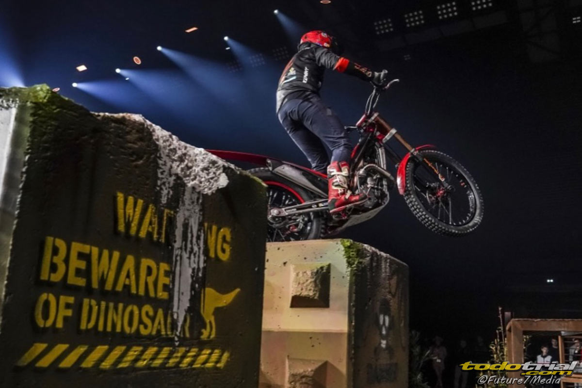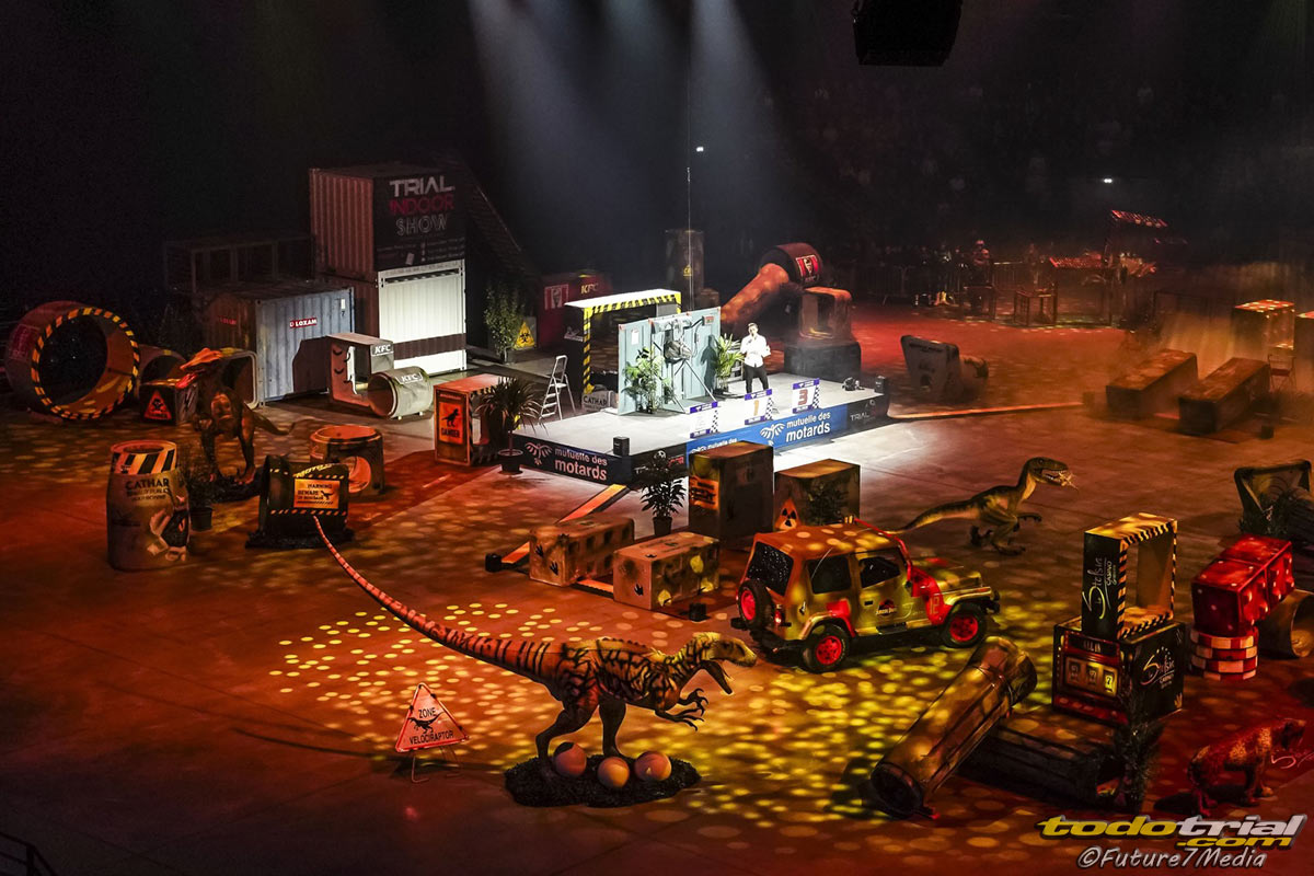 La espectacularidad del Trial Indoor de Narbonne no se limitó únicamente a lo que ocurría sobre las motos. La organización apostó por una escenografía impactante, inspirada en un auténtico “parque jurásico”, que transformó por completo el Narbonne Arena. En medio del recorrido aparecían enormes figuras de dinosaurios, vehículos 4×4 integrados como obstáculos y estructuras artificiales que reforzaban la sensación de estar compitiendo en un entorno salvaje y cinematográfico, elevando el espectáculo a un nivel pocas veces visto en una prueba indoor.