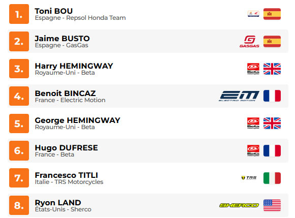 El punto de inflexión de la final se produjo en la zona 5, especialmente delicada. Jaime Busto se lanzó primero y superó la zona, pero cometió un error a la salida que le costó dos puntos de penalización. Toni Bou, por su parte, realizó un paso perfecto y salió sin penalizaciones, demostrando una vez más su sangre fría en los momentos decisivos.