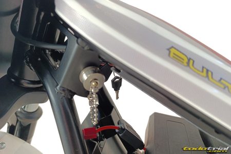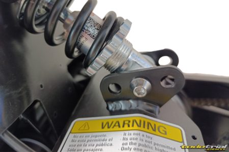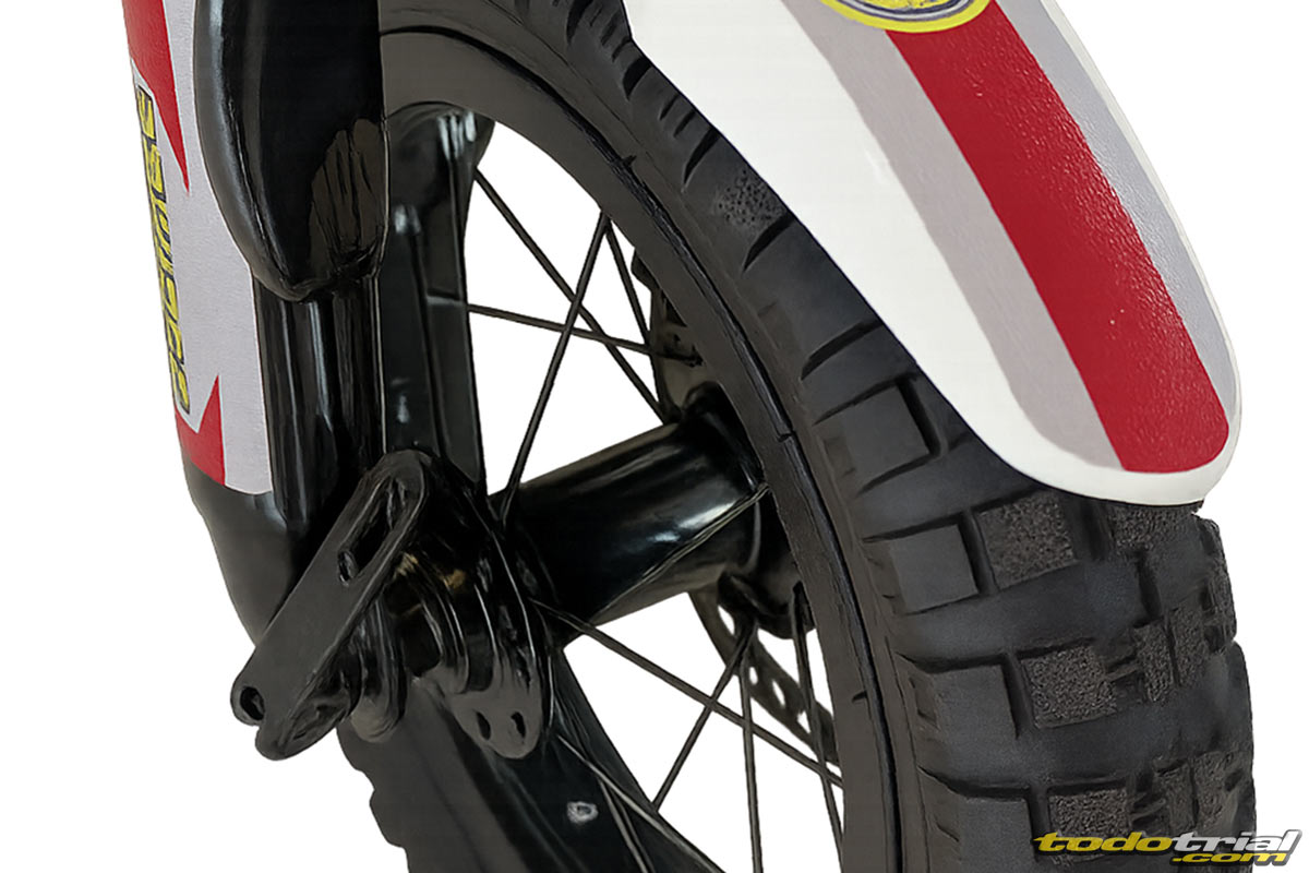 El chasis y el basculante son tubulares de acero; incorpora horquilla y amortiguador tipo BTT —con 35 mm y 25 mm de recorrido, respectivamente— y frenos de disco con accionamiento hidráulico. Sus dimensiones, una distancia entre ejes de 782 mm, altura del asiento de 385 mm, altura total de 615 mm y un peso de 24 kg.