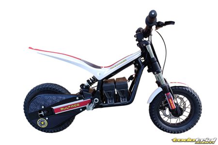 La nueva moto eléctrica infantil monta neumáticos de 12 pulgadas y un motor eléctrico de 500 W alimentado por una batería 24V 9Ah (2x12V en serie), con una autonomía aproximada de 2 horas.