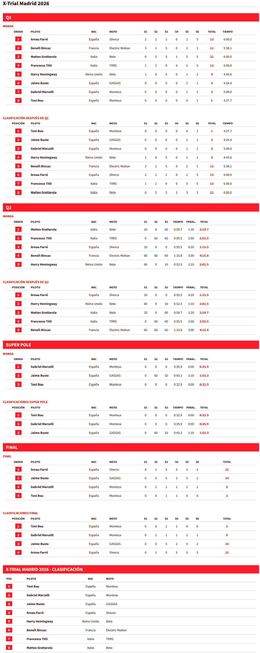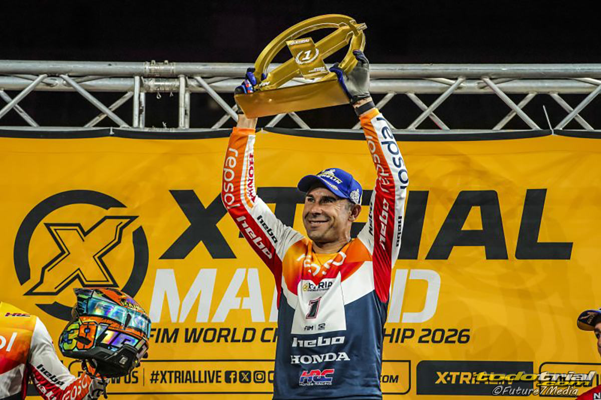 Toni Bou (Repsol Honda Trial Team) se ha adjudicado en Madrid la segunda prueba de la temporada 2026 del Campeonato del Mundo FIM de X-Trial de forma clara y contundente ya que ha finalizado su recorrido en la Final con tan solo dos puntos de penalización tras haber sido ya el mejor en la Q1.