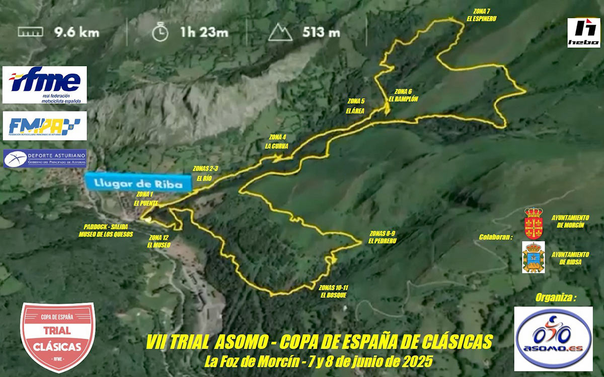 El trial constará de 12 zonas a las que habrá que dar dos vueltas, con un tiempo límite de 5:30 horas para el primer día y de 5 horas para el segundo. Estarán situadas en el Área Permanente de Trial del Ayuntamiento de La Foz de Morcín, de las cuales buena parte de ellas no se habían marcado anteriormente en la Copa de España de Clásicas. El recorrido constará de 9,6 kilómetros de interzona el primer día y de unos 6,3 km el segundo día, salvando un desnivel de 500 metros, por los terrenos de Riosa y Morcín a través de bosques, antiguas trincheras de extracción minera, caminos de calzada romana y ríos donde refrescarse, todo ello con el siempre paisaje verde típicamente asturiano como telón de fondo.