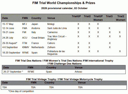 Los competidores de Trial2 volverán a unirse a los pilotos de TrialGP en las siete rondas. Las competidoras de TrialGP Femenino solo se perderán Francia y los Países Bajos, y los pilotos de Trial3 solo se perderán Japón y España. El título Trial2 Femenino se decidirá en Italia, Gran Bretaña y España.