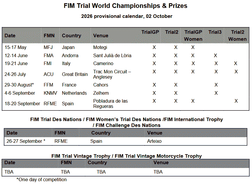 Se ha publicado el calendario provisional del Campeonato del Mundo de Trial FIM Hertz 2026, que constará de siete rondas programadas y trece días de competición puntuable, destacando el regreso a los Países Bajos por primera vez desde 2019, la visita a una sede italiana utilizada por última vez en 1992 y una sede totalmente nueva en Gran Bretaña.