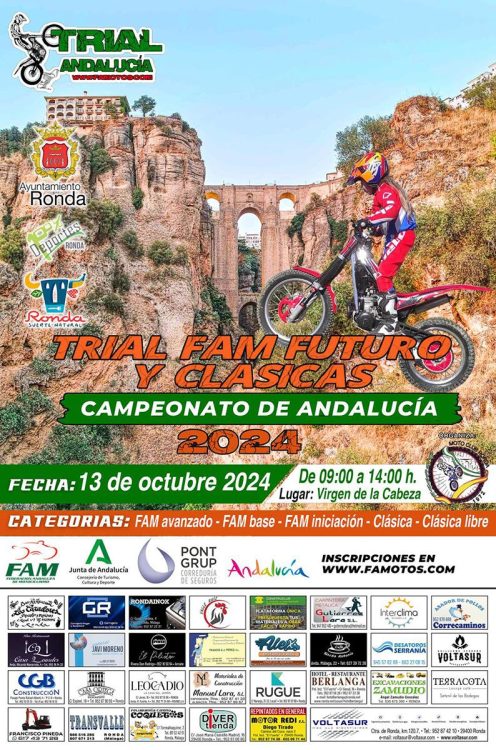 Después de pasar por Posadas, Benahavís y la Puebla de Cazalla, los pilotos se desplazarán a la comarca malagueña, concretamente al espectacular municipio de Ronda. Un lugar característico por su belleza y sus maravillosas vistas, desde lo más alto. La competición, dividida de esta forma, está causando cada vez más furor entre participantes y en el entorno del trial, puesto que es la mejor oportunidad para que las clásicas y niños puedan disfrutar de su propia carrera con una jornada exclusiva para ellos.