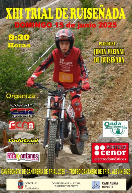 La temporada de Trial en Cantabria tiene su próxima cita en la preciosa localidad de Ruiseñada, competición que se celebrará el próximo domingo 15 de Junio, dentro del programa de fiestas de San Adrián, siendo la decimotercera edición y la cuarta de esta temporada, tras las celebradas en Cabezón de la Sal, Santullán y Valdáliga.