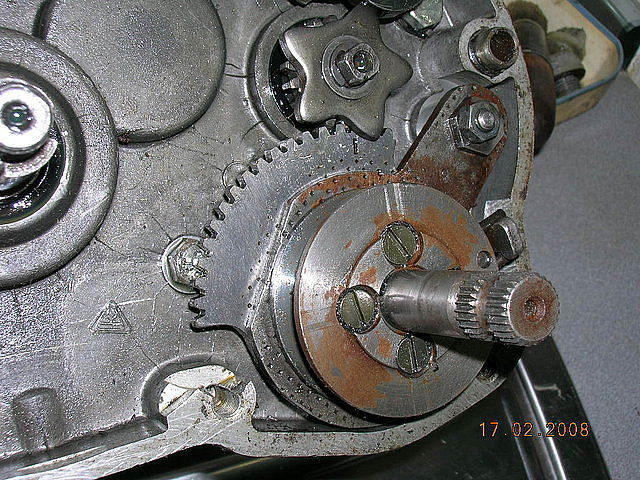 Has desmontado ya la tapa para ver si se ve algo en mal estado? Igual tienes algún diente roto o desgastado del selector y por eso cuando llegas a ese diente sigue bajando loca la palanca al no engranar. Te pongo una foto que puso nacho 247 del selector para que tengas una idea.