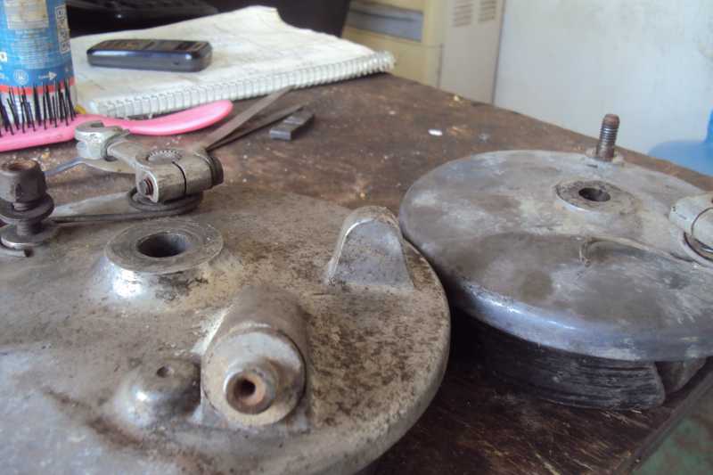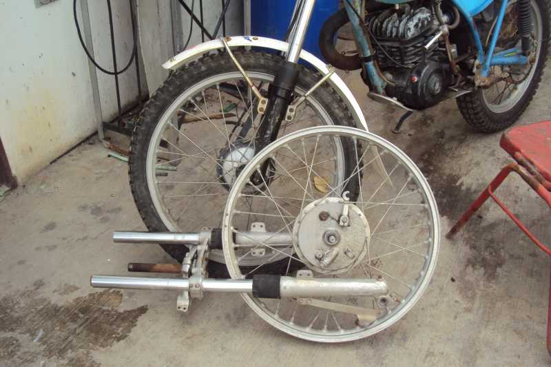 ¡¡¡Si!!! Muchachos! encontre un rin delantero de Bultaco, con barras de suspension delantera, enteritos!! me los dieron en mil pesos (45 euros>), es de Sherpa me dijo el señor y al oir eso pense en darle un abraso, aaaahhhhyyyyy!! me he encontrado partes de Bultaco Sherpa en donde no hay ni hormigas!! soy un suertudo!… luego me fijo bien y veo que son de Alpina, por las tijas, y el portabalatas mas grande en la Alpina, y las barras mas separadas y el eje de la rueda, y los rayos, y las balatas, y la tija inferior recta y, y, y, y,he quedado muy triste, en desgracia, no quedan las piezas, aaahhhhh!!, enloquecido he rebajado el portabalatas para que quede en la horquilla Sherpa que es mas angosta, lo he hechado a perder no queda nada, nada, nada aaaahhhyyyyy!! por queeeee!! solo querìa cambiar de rin, el original me hace mover de arriba hacia abajo, esta ovalado, y muy oxidado el aluminio…. chihuahua!!