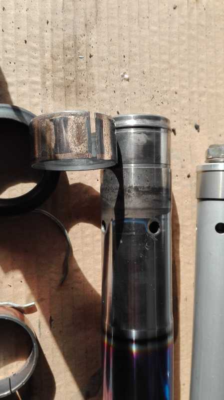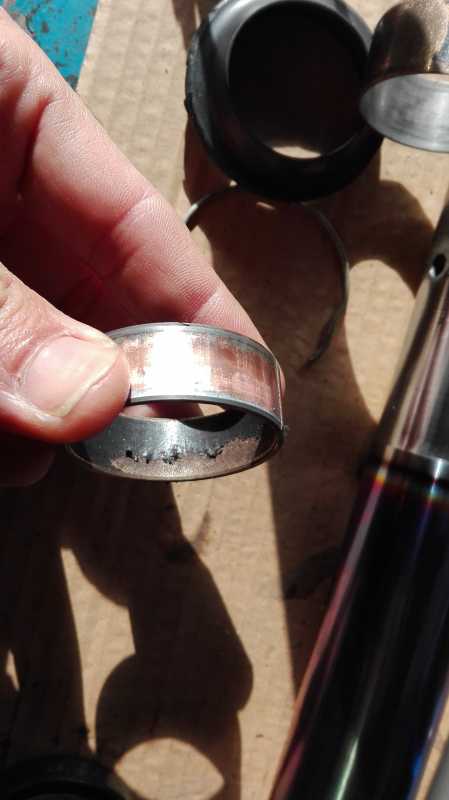 Os pongo fotos de los dos casquillos que voy a sustituir. Están desgastados, deben de estar cubiertos por un material tipo nylon o parecido de color gris. Esto es lo que tropieza uno con el otro al querer sacar la barra de la botella, y con ello también te traes el retén. Gracias a mi amigo Pancho que es un maquina.