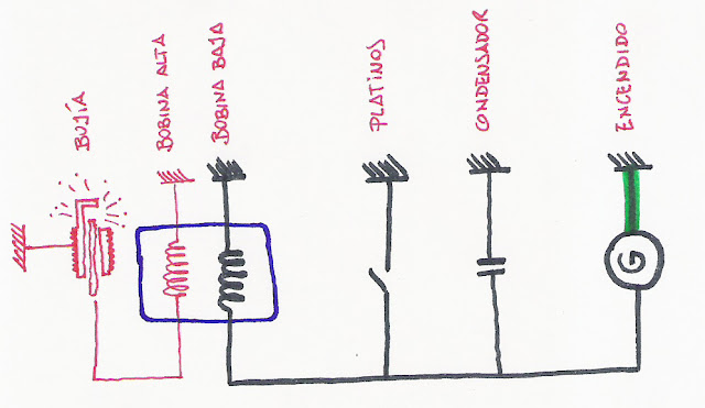 En caso de que el platino se cierre, la corriente deriva por él directamente a masa, con lo que no pasa por la bobina. Al producirse la caida de tensión en la bobina primaria, esta induce en la secundaria (pintada en rojo) una corriente de baja intensidad (milésimas de amperio) y alto voltaje (miles de voltios), que es la que produce la chispa en la bujía, cuyo cuerpo hace masa a través de la culata (de ahí que la culata, y por ende el motor, deban de ser «masa», para cerrar el circuito. Básicamente, la bobina es un simple transformador de voltaje.