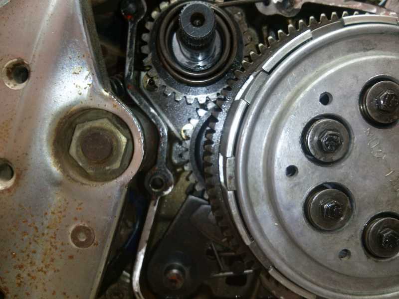 Nada, he desmontado el embrague, y sigue igual. Parece como si el eje del arranque estuviese desplazado hacia afuera, pero está en la vertical perfecta del eje en el que engrana.