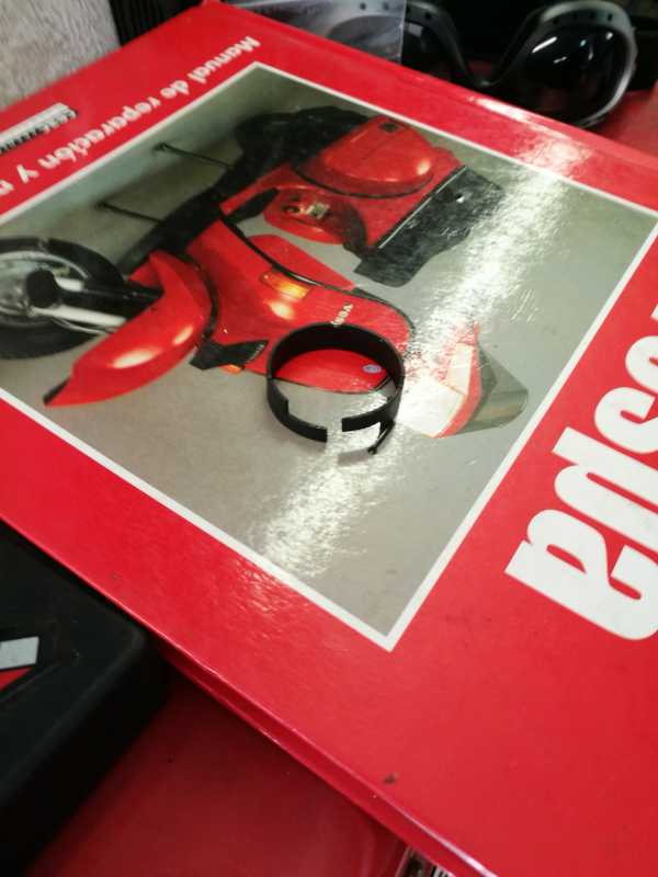 He tenido que desmontar la horquilla de mi cita 349/4 y me he encontrado que una de las arandelas de plastico del hidraulico tiene una esquina partida.