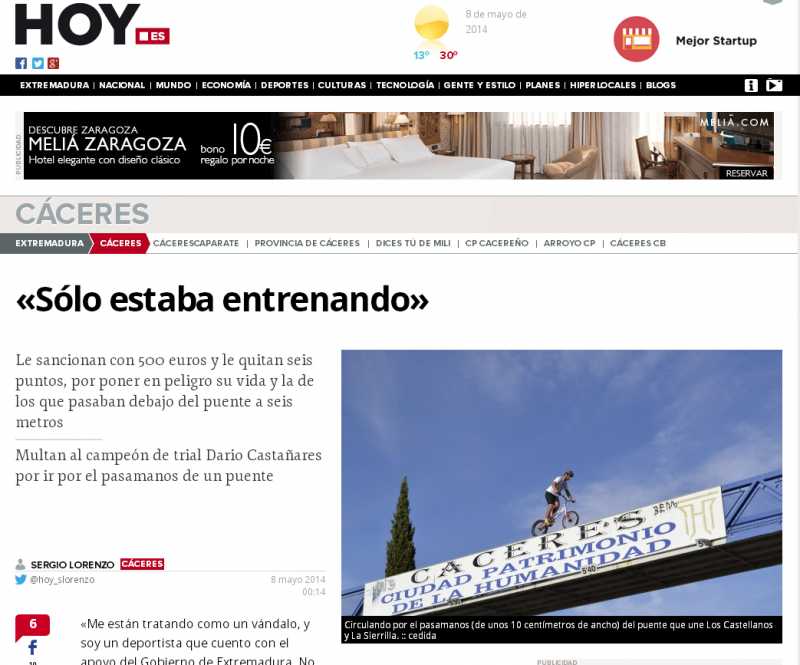 El piloto extremeño de Trialbici Darío Castañares (campeón de Extremadura, Andalucía, Portugal y 11º del mundo) ha sido sancionado con 500 euros y la retirada de 6 puntos del carnet de conducir por subirse al pasamanos de un puente peatonal de nuestra ciudad.