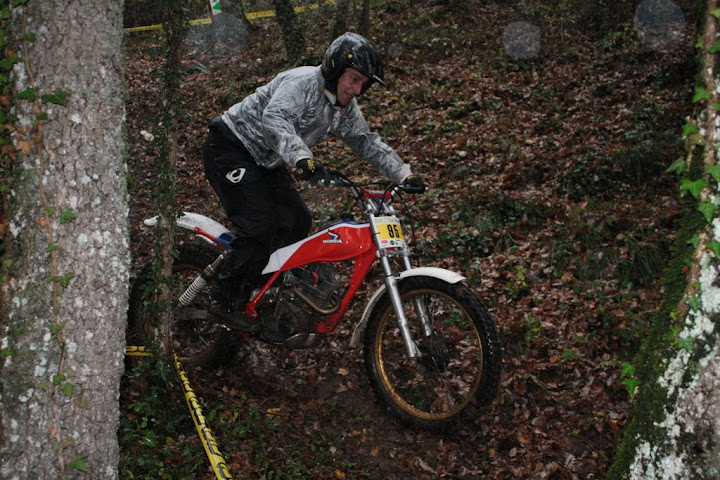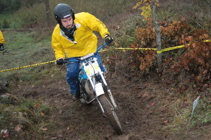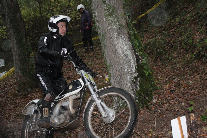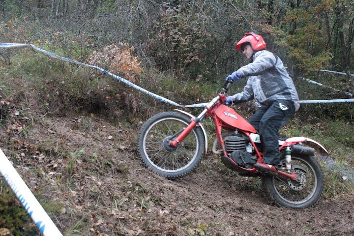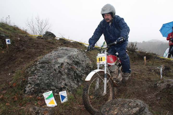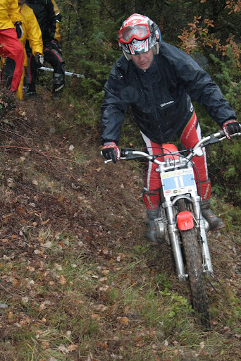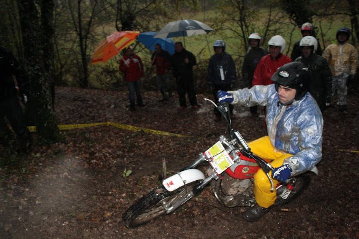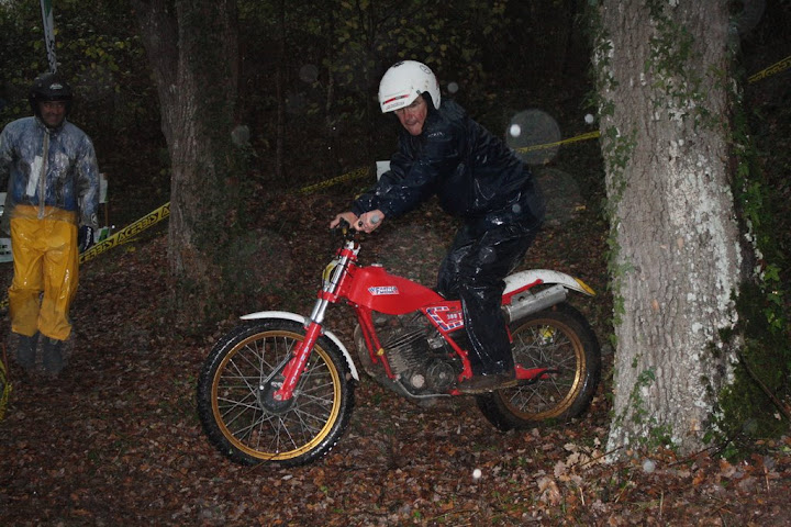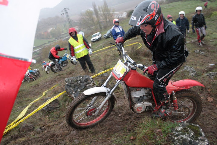 Yo también me encontré con Vanetrial en la zona 10, pero justo de frente. Os explico. La zona 10 se las traía. La primera parte era la más difícil y la pasé a 1 punto, pero cuando me toca afrontar la segunda subida embarrada, la moto se queda sin tracción justo en el quicio. Como me empeñé en no poner el pié ocurrió lo que tenía que ocurrir. La moto me hizo un extraño, saqué el pié pero ya era tarde. Al ponerlo en tierra resbaló y la moto salió justo ladera abajo y a toda castaña. Paso el límite de zona y aquello no frenaba y lo peor es que me dirigía directo a un precipicio que había al lado. Pero por fortuna había unos cuantos espectadores que no dudaron en pararme en mi trayectoria hacia el vacío (ya que no tuvieron otra opción ya que fui contra ellos como un miura). Pues bien, la primera que estaba era Vanetrial, así que GRACIAS!!!! Si no es por tí y por los que te acompañaban no sé que hubiera pasado. Eso sí, las risas fueron tremendas, debajo de la lluvía, pero todos, lo que se dice todos descojonados de la risa, jueces incluidos, jajajaja. Esto es lo que mola del trial clásico.