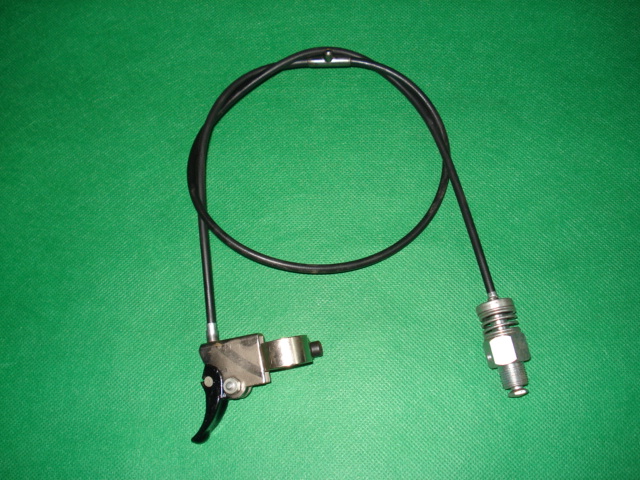 El cable esta unido al descompresor, lo que llamas tornillo, que esta roscado en la culata, rosca de bujía y ese debe de llegar hasta el manillar, donde se conecta a una maneta de pequeñas dimensiones. Sirve para arrancar el motor, el arranque a patada es duro, pero una vez cogido el truquillo no hace falta..