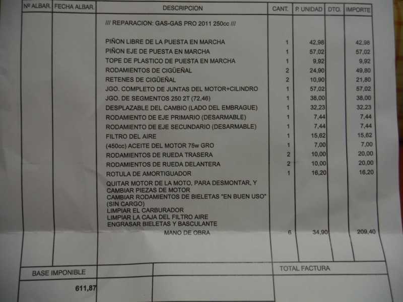 Si nada más que apalabraste motor, desde la línea del filtro del aire menos el aceite, sobra todo aparte un 40% aprox. de mano de obra. Una cosa que no me queda claro es lo de los cojinetes de aguja de las bieletas, «cambiados en buen uso» (sin cargo).