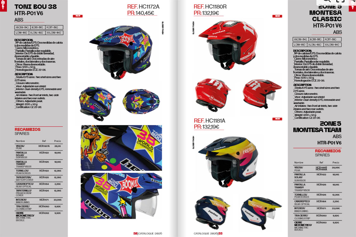 Entre los lanzamientos más destacados se encuentra la nueva gama de cascos de trial, que llega con una gran variedad de modelos y colores. Hebo renueva familias emblemáticas como los Zone 5 —en sus versiones RS, Duo, Camo y Pro—, los Race, así como ediciones especiales tan esperadas como los nuevos diseños Toni Bou 38, Montesa, Repsol y Electric Motion.