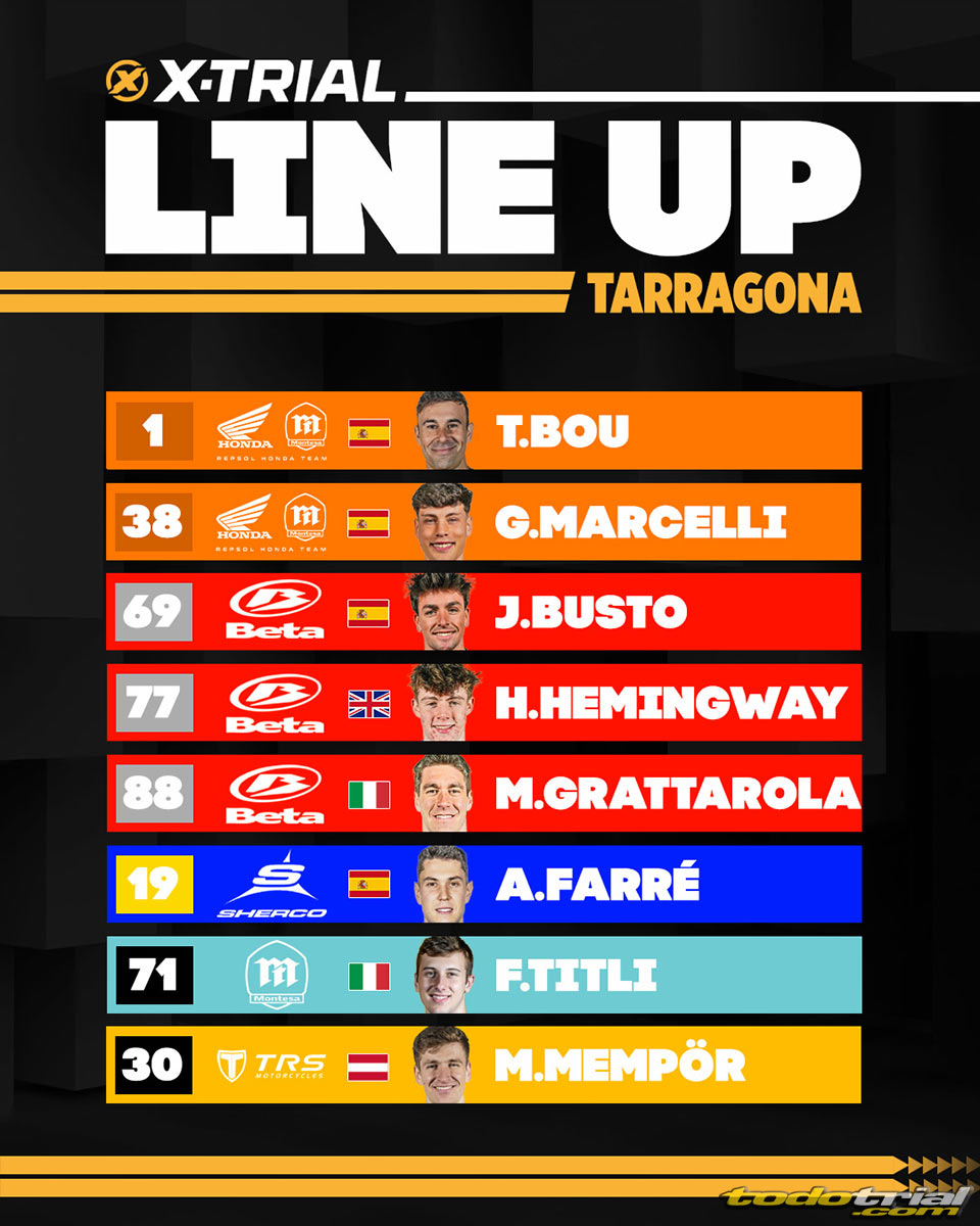 Como es habitual y establece el reglamento para la segunda parte de la temporada, los tres pilotos anteriormente citados se unirán a los que ocupan las cinco primeras posiciones. Toni Bou (Repsol Honda Trial Team) llega a este X-Trial Costa Daurada estrenando su 20º título de Campeón del Mundo de X-Trial junto a su compañero de equipo Gabriel Marcelli (Repsol Honda Trial Team) y Jaime Busto (Beta). Ambos pilotos se están jugando aún el Subcampeonato del Mundo. A ellos se añaden Harry Hemingway (Beta), revelación de la temporada y el italiano Matteo Grattarola (Beta). Tres nacionalidades distintas están representadas en el Top5 del Campeonato que pondrá su broche final a orillas del Mediterráneo.