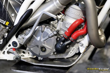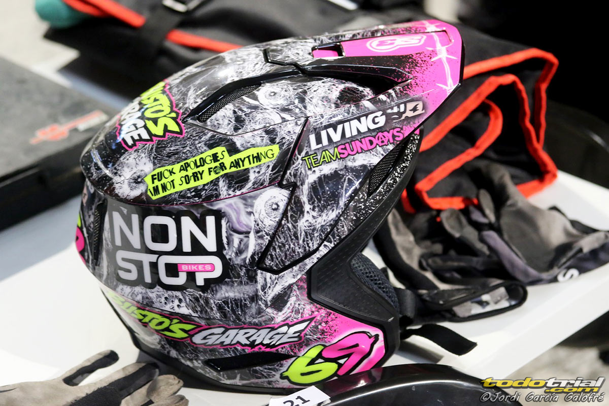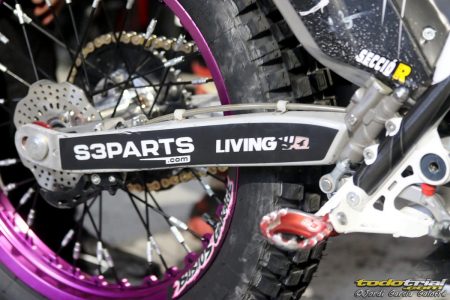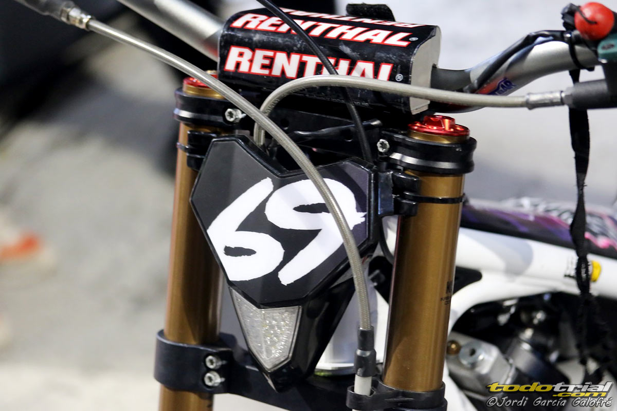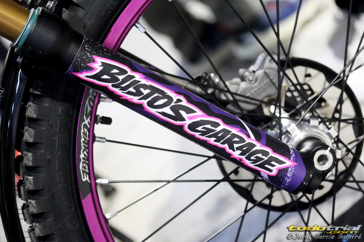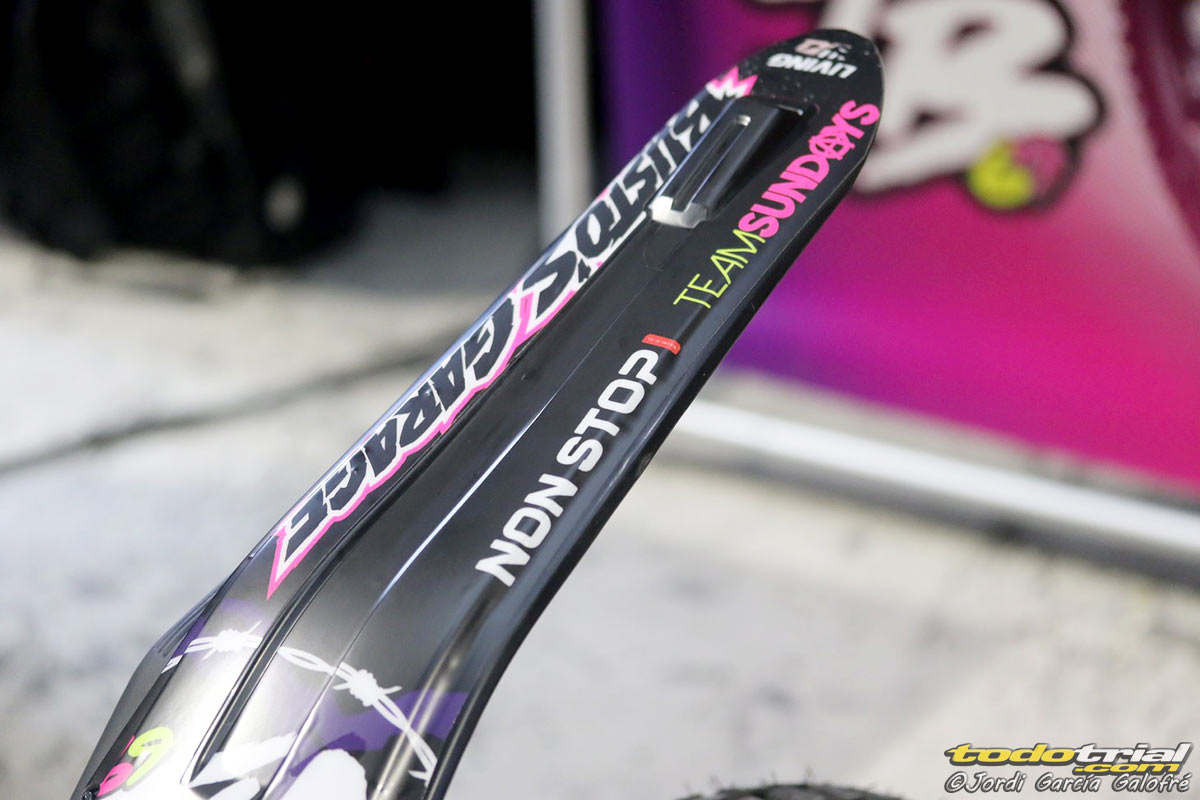 Chasis en blanco, llantas fucsias y plásticos negros decorados con gráficos en blanco que le daban una identidad muy personal bajo la firma de Busto’s Garage. En esta decoración no faltan los adhesivos de sus patrocinadores personales, los que le están apoyando en estos complicados momentos, como es el caso de Non Stop Bikes , la tienda especializada en trial que está con él desde que era un niño, y S3 Parts, ahora su sponsor principal.