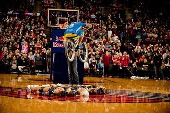 Su última actuación en la pista de los Golden State Warriors. En la imagen adjunta podemos verle realizar un salto espectacular sobre las animadoras del equipo sobre su bici de 26″.
