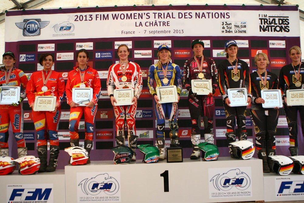 El equipo de Gran Bretaña representado por Emma Bristow (Sherco), Rebekah Cook (Beta) y Joanne Coles (Gas Gas) fueron las vencedoras del Trial de las Naciones Femenino FIM 2013 celebrado en La Chatre, Francia. Las británicas dominaron el trial de principio a fin con un total de penalizaciones inferior a la mitad de las siguientes rivales.