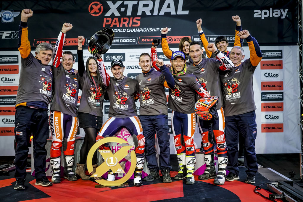 Mientras tanto, Toni Bou, se ha clasificado quinto realizando un gran esfuerzo ya que han pasado sólo 25 días desde que sufrió la lesión en la que se fracturó tres vértebras. El español se ha anotado su decimosegundo título de Campeón del Mundo de X-Trial y ha seguido haciendo historia en unas condiciones físicas muy duras aunque, en la primera vuelta, ha sido el mejor. Ya en la segunda, la columna le ha pasado factura y no ha podido competir a su nivel habitual sumando 16 puntos de penalización.