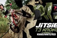 Jitsie presenta su nueva equipación T3 Kroko en edición limitada con los colores kaki / blanco / rojo simulando los verdaderos colores del cocodrilo. El lanzamiento de esta última versión de la gama Kroko se propone romper los límites tradicionales de diseño y funcionalidad en el trial, llevando tanto el diseño como la comodidad a un nivel superior.