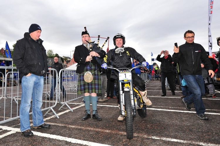 A las 7:30 de la mañana comenzaba puntualmente una nueva edición de los Scottish Six Days Trial, y como manda la tradición bajo la pancarta de salida el primero en arrancar su moto sería el dorsal número uno del total de 279 participantes que este año han completado las verificaciones.