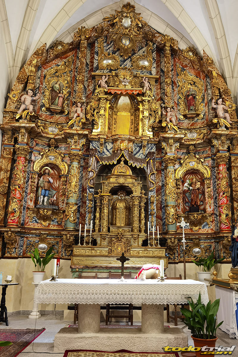 En el interior, (que es de columnatas de sillería y bóvedas en el presbiterio y crucero de sencilla crucería de nervaduras y aristones, con naves cubiertas de artesonados de madera sencilla), destaca la capilla mayor, cuya pared del fondo se cubre de enorme retablo de líneas y gusto barroco, no hace mucho restaurado.