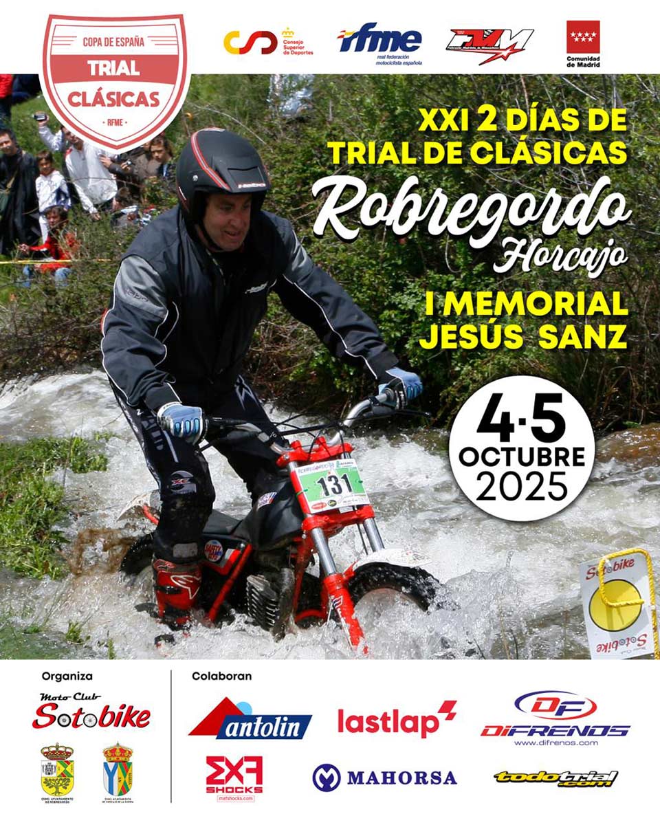 A destacar que esta edición lleva el sobrenombre de Memorial Jesús Sanz, en recuerdo del activo miembro del Moto Club Sotobike que tantas veces ayudó en la organización de esta prueba y en la que fue participante habitual. Un piloto con larga trayectoria trialera y muy querido entre los aficionados, tal y como os contamos a comienzos de junio en este artículo: «Fallece Jesús Sanz, figura entrañable del trial madrileño.» A las 18:30 del sábado se realizará un acto en su memoria, y se dará un aperitivo a todos los asistentes.
