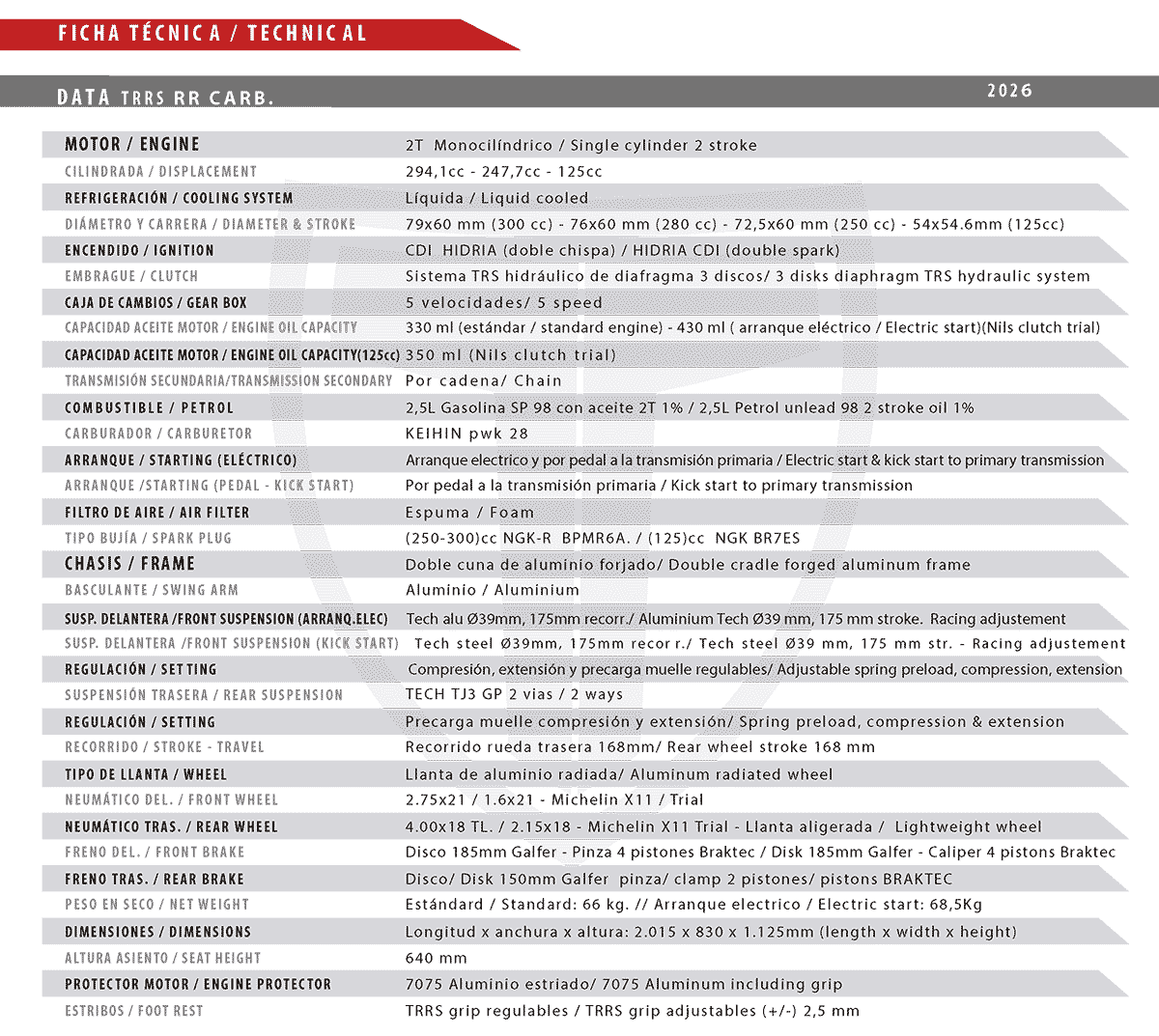 Por lo tanto se confirma la continuidad en la fabricación de su consolidada versión de carburación, un modelo que ha demostrado a lo largo de los años un funcionamiento fiable, robusto y con unas prestaciones plenamente adaptadas a las exigencias del trial tanto a nivel amateur como profesional.