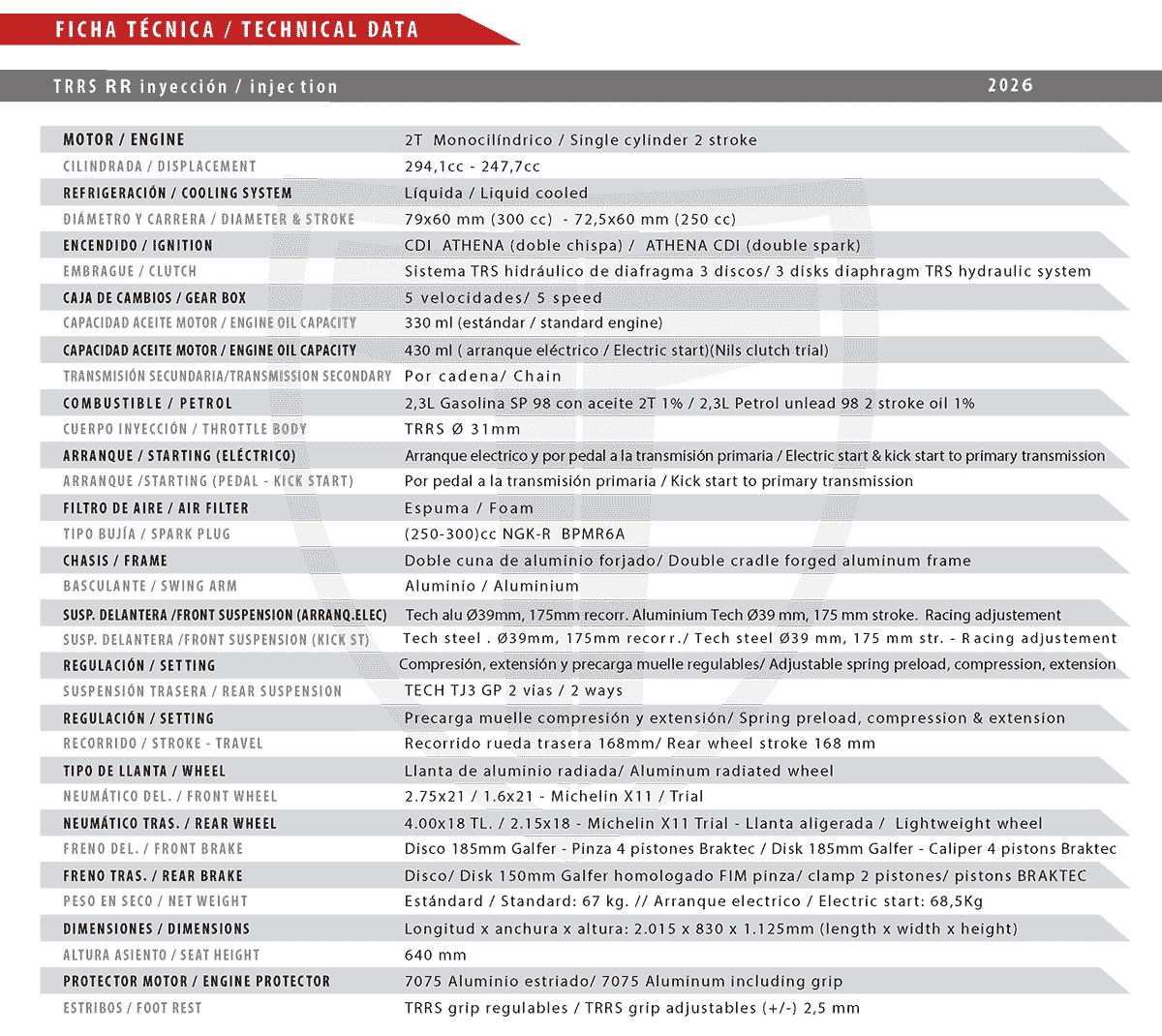 Con estas mejoras, TRS refuerza su compromiso con la innovación y la calidad, ofreciendo un modelo que mantiene el carácter y la competitividad de la marca, adaptando sus motocicletas a las exigencias y necesidades del trial actual.