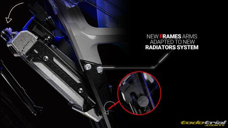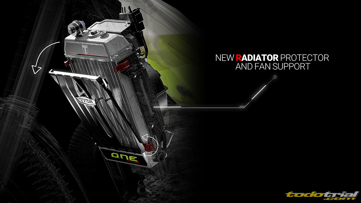 Conjunto radiador: Rediseño del conjunto de radiador que incluye: nuevo radiador, protector rediseñado, soporte de ventilador, ventilador de nueva generación, goma de soporte del CDI y nuevo sistema de silentblocks para un mejor soporte del conjunto y aislamiento de vibraciones.