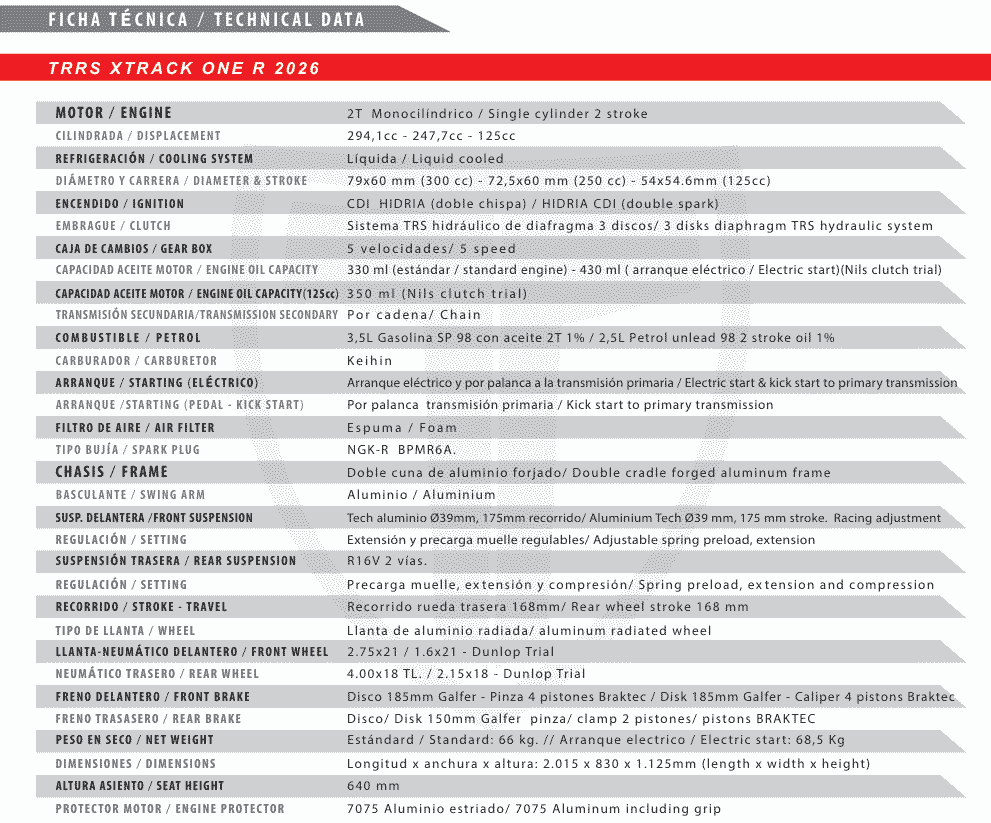 TRRS anuncia el lanzamiento de su nuevo modelo de trial excursión, la XTrack One R, que integra en una sola motocicleta las cualidades más destacadas de dos de sus referencias actuales, la Xtrack RR y la Xtrack One. Esta iniciativa responde a la estrategia de la marca de optimizar su gama, reduciendo el número de modelos para ofrecer una opción más completa y equilibrada.