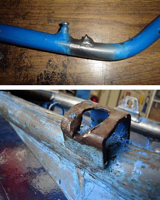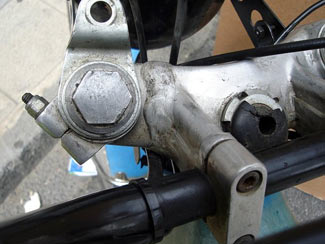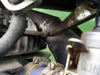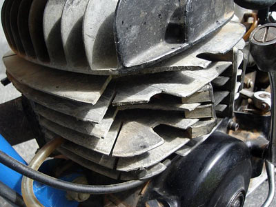 De vuelta al garaje, primera inspección visual a fondo y ya detectamos algunas cosillas: lo primero unas aletas del cilindro rotas, roto también el tirante del chasis a la culata, la tija superior soldada, las manetas... puajjjjj, el manillar torcido, el pedal de freno esto así de entrada.