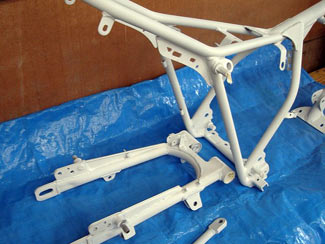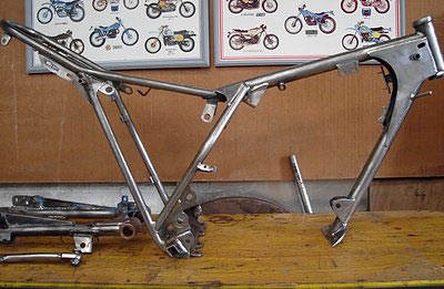 Una vez las dos partes separadas (chasis y basculante) les aplico un decapante para sacar la pintura vieja y aprovecho para reparar un tope donde apoya la horquilla al girar, el apoyo de la pata en el basculante, el tetón de la propia pata y alguna pletina-pasacables que estaba rota. Lija, imprimación, más lija, pintura y laca. El chasis quedó de cine. Aqui ya podeis ver que empiezan los cambios y es que a mi tanto azul como que no me gustaba mucho y por eso lo primero en cambiar ya fue el color del chasis.