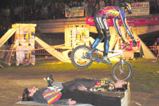 Ya preparado "Juanfra" hizo casi sin pestañear todas las zonas que minutos antes las motos habían ejecutado, incluso se permitió el lujo de hacer todo lo que le pedía el locutor de megafonía. Explicar todo lo que hizo este piloto casi es empresa difícil, pues si los mayores disfrutamos con las motos, los más pequeños e incluso no tan pequeños, no daban crédito a lo que veían hacer, todo tipo de cabriolas y saltos espectaculares. Incluso hubo participación de dos señoritas las cuales se presentaron voluntarias para que el piloto de Linares les hiciera todo tipo de virguerías, incluidas el quitar un pequeño taponcito de la punta de la nariz de una voluntaria simplemente con un golpe técnico de la rueda delantera de la bicicleta. Debemos puntualizar que la dificultad era añadida por el verdín mojado y el barro que poco a poco se iba formando en el cauce, ya que cuánto más avanzaba la noche más se notaba la humedad.