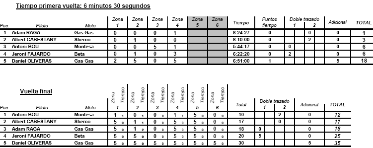 Tras una primera vuelta sorprendente por la gran dificultad de los obstáculos y los en general malos resultados obtenidos por los pilotos, el orden de salida para el play off final quedaba con Oliveras saliendo el primero, con 18 puntos, seguido de Jeroni Fajardo, con 6, Toni Bou con la misma puntuación y, más tarde, Cabestany con 3 y Adam Raga con 1.