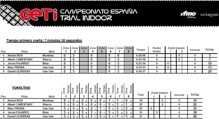 En esta ocasión, como ya ocurriera el año pasado, el piloto de Montesa Honda, Toni Bou, obtuvo un triunfo arrollador sobre sus rivales. Tras él, Cabestany (Sherco) y Marc Freixa (Gas Gas) fueron segundo y tercero respectivamente.