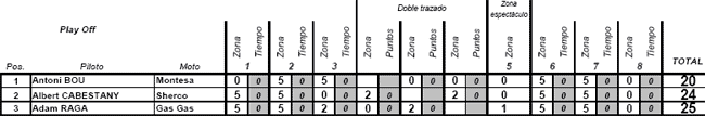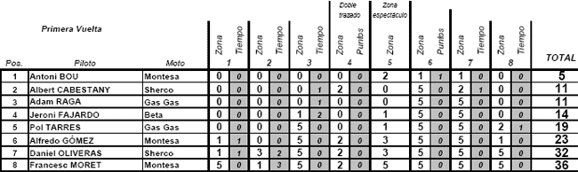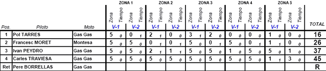 Pol Tarrés (Gas Gas) se ha destacado al igual que ya hiciese en Zaragoza, finalizando con una puntuación de 16 puntos en el total de las dos vueltas a las cinco zonas seleccionadas. Diez puntos más ha sumado Francesc Moret (Montesa) por lo que son estos dos los que consiguen el pase como invitados a la jornada del sábado del indoor de Tarragona.
