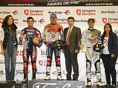 Toni Bou se ha proclamado vencedor de la XXIII edición del Trial Indoor Fiestas del Pilar de Zaragoza, prueba inaugural del Campeonato de España de Trial Indoor. Jeroni Fajardo y Albert Cabestany le han acompañado en el podium del recinto zaragozano, un Pabellón Príncipe Felipe de Zaragoza lleno a rebosar que aplaudió con fuerza la entrada de los pilotos en la pista y todas sus actuaciones, animando a cada uno de ellos durante sus ejecuciones.