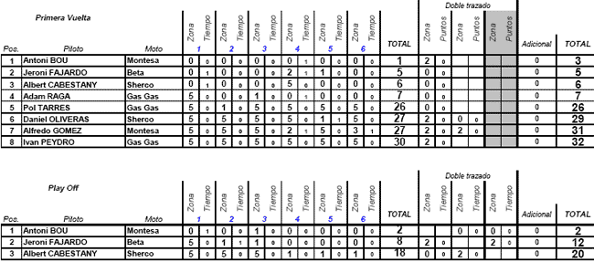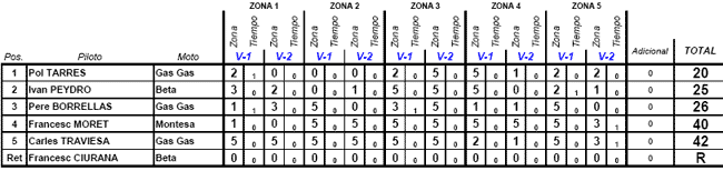 Los seis pilotos convocados han sido Pol Tarrés (Gas Gas), Pere Borrellas (Gas Gas), Carles Traviesa (Gas Gas), Iván Peydro (Beta), Francesc Ciurana (Beta) y Francesc Moret (Montesa), que se han tenido aque enfrentar a cinco zonas en dos vueltas.