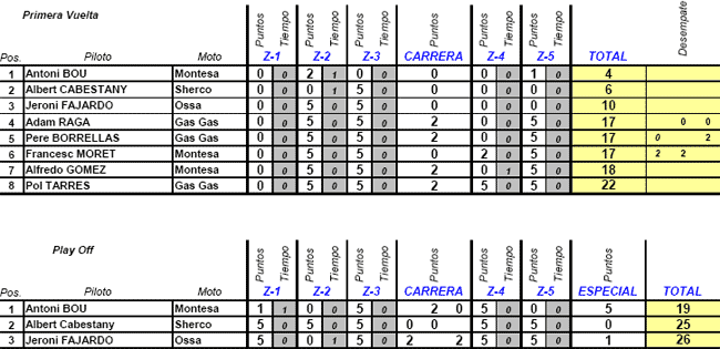En la clasificación general Bou es líder con 20 puntos, seguido de Cabestany (14) y Raga (13). De esta forma, todo queda aún por decidir de la cara a la última cita de la temporada, cuya fecha y localización se anunciarán en los próximos días. Toni Bou: "Estoy increíblemente satisfecho por este triunfo. Quizá no esté bien que lo diga yo pero lo cierto es que considero haber hecho una carrera muy, muy buena, con un pilotaje fino pero también agresivo. Una victoria de aquellas con las que uno se siente completamente a gusto y a la que de cara al campeonato otorgo un gran valor." Àdam Raga: "Ha sido una decepción. Esta carrera de Girona siempre es especial y quería hacerlo bien, pero no he estado fino y he cometido demasiados errores. Es habitual que en estas pruebas del campeonato de España 'indoor' haya zonas muy fáciles y otras muy difíciles de superar y hoy hemos fallado en la mayoría de esos puntos en los que se trata de pasar o de sumar un 5. No me he sentido a gusto y lo he pagado muy caro. Lo lamento por el equipo y por todo el público que esperaba verme ganar. Tenemos que aprender de días como estos, porque hacerlo bien depende de muchos factores y hoy no los hemos tenido todos controlados. Es un pena, pero hay que seguir adelante y trabajar para que no vuelva a suceder".