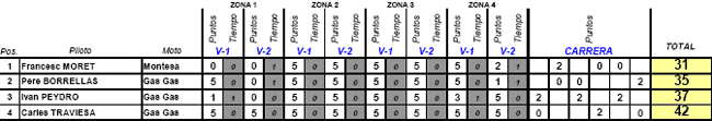 Francesc Moret vence en el trial Junior En la tarde del lunes 31 de octubre se ha celebrado el Indoor de Girona en la categoría Junior, en la que Francesc Moret ha sido el vencedor. Siguiendo con el proceso habitual desde el pasado año, los pilotos del CETI Junior han disputado a puerta cerrada la ronda clasificatoria puntuable para el Campeonato de España de Trial Indoor en su categoría Junior, o CETI Junior Challenge, de la que los dos mejores saldrían calsificados para participar en la categoría absoluta al día siguiente, ya con las gradas repletas de público. Los cuatro pilotos participantes han sido los mismos que en el Indoor de Zaragoza: Pere Borrellas (Gas Gas), Francesc Moret (Montesa), Iván Peydro (Gas Gas), y Carles Traviesa (Gas Gas), que han tenido que superar cuatro zonas en dos vueltas, más tres carreras en paralelo. Las zonas dos y tres se han mostrado imposibles para los cuatro pilotos, que no han podido superarlas en ninguna de las dos vueltas, por lo que las zonas 1 y 4 han sido decisivas. En una lucha muy apretada, finalmente se ha impuesto Francesc Moret al sumar un total de 31 puntos, cuatro menos que Pere Borrellas que ha sido segundo. Por tanto estos son los dos pilotos clasificados para la jornada siguiente y que competirán junto a los de la categoría absoluta. Por sólo 2 puntos (37), ha quedado fuera Iván Peydrò, mientras Carles Traviesa ha sido cuarto con 42.