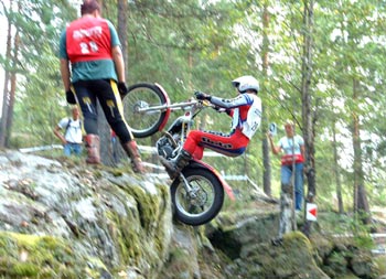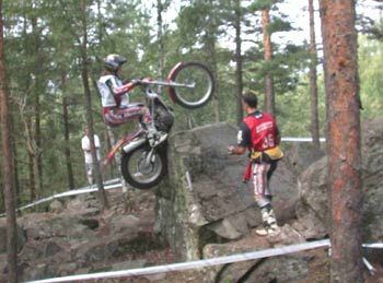 La zona 14 era a primera vista impresionante. Primero un respetable escalón cubierto de musgo resbaladizo. A continuación era necesario levantar la cabeza bastante y a la izquierda para ver las dos flechas rojas que marcaban el siguiente paso. Por suerte para los pilotos una especie de escalón intermedio facilitaba este paso. Finalmente un paso en subida conducía al final de la zona. Para Pepe Saez esta zona fue funesta pues en la segunda vuelta hizo un fiasco que le hundió en la clasificación. Aparte de Pepe, muchos otros pilotos lo pasaban mal, pues las penalizaciones aquí si fueron altas. En la primera vuelta sólo pasaban a cero Pepe Sáez, Orizio, Sergio León y Blazusiak. Fajardo estrenaba su marcador con un varios, por lo que era superado por Blazusiak. Esta zona representó un buen castañazo para Laia y su padre que se había situado en el escalón de entrada. Laia consiguió inicialmente subir el escalón pero cuando ya arrancaba hacia el siguiente paso empezó a patinar puso pie, resbalo y cayo del escalón junto con su padre ante el susto del público por lo visto no muy acostumbrado a ver trial de este tipo. Afortunadamente Laia no sufrió daño y el control le permitió repetir la zona, con el cinco ya marcado. Esta vez Laia conseguía pasar a cero.