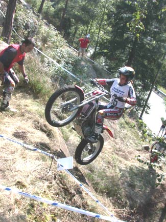 El trial que preparó el moto club local, de difícil nombre, parecía en principio complicado. Las zonas eran todas, eso si, muy amplias sin pasos ratoneros, pero algunas con grandes escalones y espectaculares subidas que te obligaban a levantar la cabeza desde el principio de la zona para ver las dos flechas rojas que marcaban el paso. En cambio había tres zonas muy fáciles, quizás con el objeto de que todo el mundo y en particular algunos pilotos locales, pudieran superar por lo menos algunas.