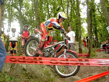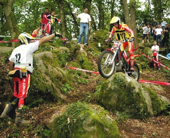 De nuevo Dani demostró su categoría y concentración y encadenó cuatro ceros consecutivos, en la zona 7 dejó un pie y de nuevo dos ceros más. En la zona 10 perdimos el trial, en la salida de ésta zona había un doble y entre las dos piedras había un árbol, al pasar Dani tocó con el codo el árbol, digo tocó porque de haberse apoyado y parado hubiera sido bastante difícil sacar la moto de allí, y más que beneficiarle el toque le perjudicó ya que salió un poco descontrolado. El control del final marcaba cero, pero el responsable de la zona marcaba uno y como allí mandaba él era uno, incluso me dijo que a todos los que tocaban el árbol les marcaba un pie y me llegó a enseñar la tabla de puntuaciones para que lo viera y como todos sabemos que los pilotos y mochileros españoles tenemos poco que hacer con los controles franceses salimos de la zona con un uno.