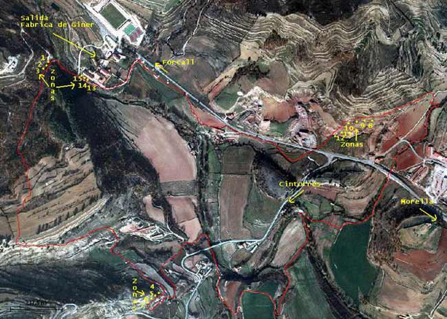 El trial estara dividido en tres grupos de zonas ,el primer grupo de zonas estará en la Fabrica de Giner desde donde dara comienzo la prueba y donde estan situadas las zonas 1-2-3- y las zonas 13-14-15.
