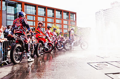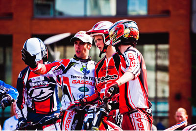 La competición principal se desarrolló en tres mangas, cada una compuesta de cinco zonas. Cada uno de los tres pilotos de cada equipo pasaba las zonas por un sistema de relevos registrando un tiempo total para su equipo. Como añadido a su tiempo de ejecución los pilotos eran penalizados con cinco segundos extra por cada pie, de este modo se establecía un formato simple y dinámico para que fuera entendido por una audiencia no muy especializada. Un punto era otorgado al equipo ganador de cada zona, con un máximo de cinco puntos disponibles en cada manga. El equipo de Lampkin obtenía la ventaja inicial al ganar la primera manga por 3-2 , ya que demostró ser el más rápido en la última zona, la de la fuente. Casi calcando la actuación de sus rivales, el equipo de Raga se adjudicaba la segunda manga estableciendo un empate. Una tensa tercera y última manga se disputó enfrente de una muchedumbre de espectadores que corría de una zona a otra para seguir el desarrollo de la prueba.